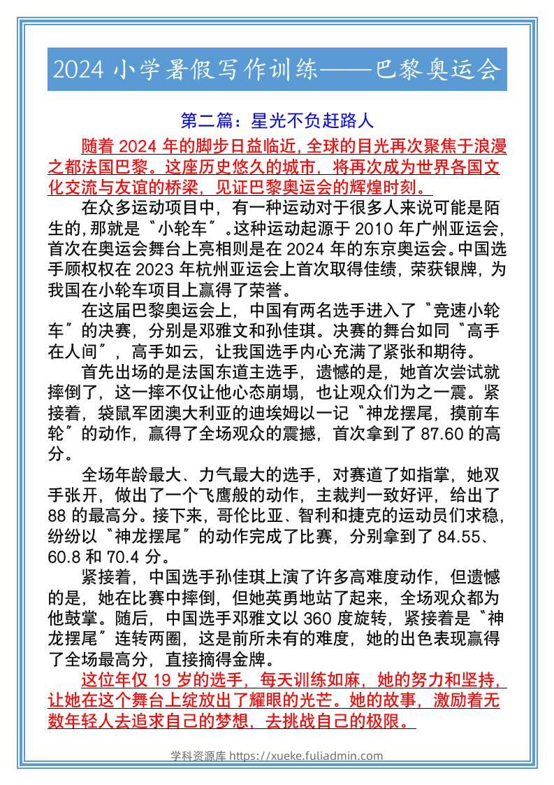 2024小学暑假写作训练——巴黎奥运会-小升初语文学科资源库4个月前发布关注私信56152024小学暑假写作训练——巴黎奥运会-小升初语文此内容为付费资源,请付费后查看¥10黄金会员免费钻石会员免费立即购买您当前未登录!建议登陆后购买,可保存购买订单格式docx页数4 页大小37.62 KB付费资源 ——预览已结束,还剩2页未读——开通会员后可免费下载高清完整文档 © 版权声明文章版权归作者所有,未经允许请勿转载。THE END小升初 喜欢就支持一下吧点赞15 分享QQ空间微博QQ好友海报分享复制链接收藏