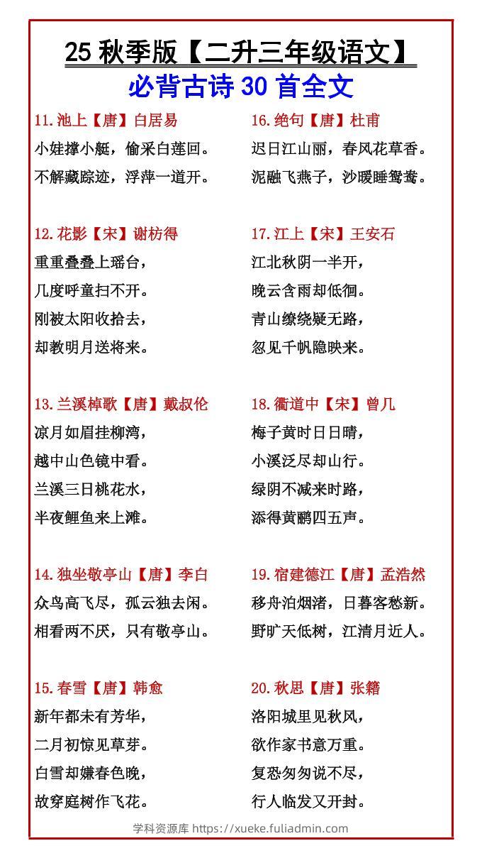 【2025秋新版】【二升三年级语文】必背古诗30首全文-三上语文学科资源库3个月前发布关注私信2915【2025秋新版】【二升三年级语文】必背古诗30首全文-三上语文此内容为付费资源,请付费后查看¥10黄金会员免费钻石会员免费立即购买您当前未登录!建议登陆后购买,可保存购买订单格式pdf页数6 页大小164.64 KB付费资源 ——预览已结束,还剩4页未读——开通会员后可免费下载高清完整文档 © 版权声明文章版权归作者所有,未经允许请勿转载。THE END小学语文 喜欢就支持一下吧点赞15 分享QQ空间微博QQ好友海报分享复制链接收藏