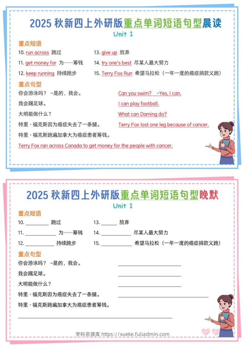 新四上外研英语重点单词短语句型晨读晚默13页学科资源库4小时前发布关注私信2213新四上外研英语重点单词短语句型晨读晚默13页此内容为付费资源,请付费后查看¥10黄金会员免费钻石会员免费立即购买您当前未登录!建议登陆后购买,可保存购买订单格式pdf页数13 页大小8.96 MB付费资源 ——预览已结束,还剩11页未读——开通会员后可免费下载高清完整文档 © 版权声明文章版权归作者所有,未经允许请勿转载。THE END小学英语 喜欢就支持一下吧点赞13 分享QQ空间微博QQ好友海报分享复制链接收藏