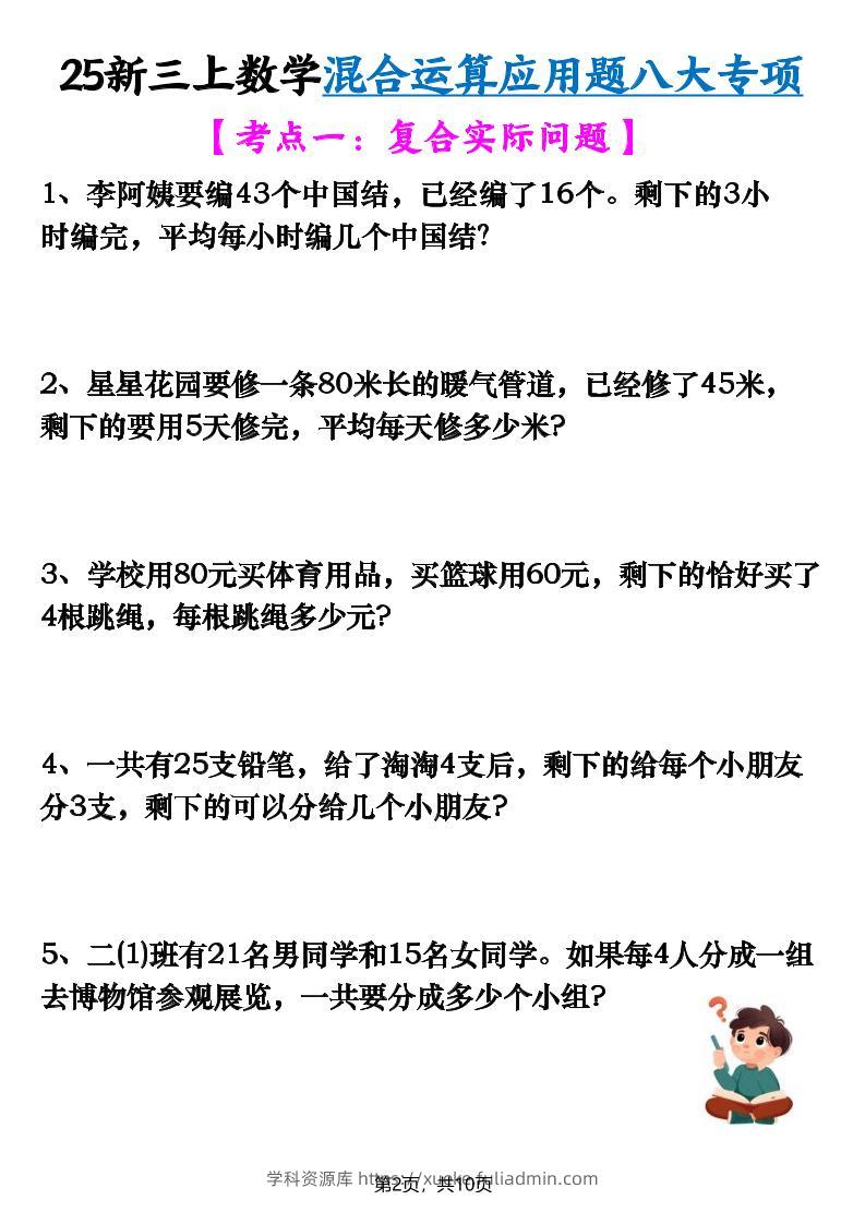 25新三上数学混合运算应用题八大专项(含答案10页)学科资源库6小时前发布关注私信49925新三上数学混合运算应用题八大专项(含答案10页)此内容为付费资源,请付费后查看¥10黄金会员免费钻石会员免费立即购买您当前未登录!建议登陆后购买,可保存购买订单格式pdf页数10 页大小701.05 KB付费资源 ——预览已结束,还剩8页未读——开通会员后可免费下载高清完整文档 © 版权声明文章版权归作者所有,未经允许请勿转载。THE END小学数学 喜欢就支持一下吧点赞9 分享QQ空间微博QQ好友海报分享复制链接收藏