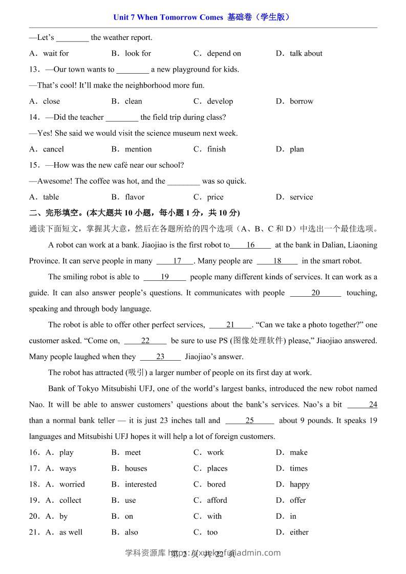 八年级上英语Unit7基础卷(人教版)学科资源库2小时前发布关注私信5013八年级上英语Unit7基础卷(人教版)此内容为付费资源,请付费后查看¥10黄金会员免费钻石会员免费立即购买您当前未登录!建议登陆后购买,可保存购买订单格式pdf页数22 页大小846.34 KB付费资源 ——预览已结束,还剩20页未读——开通会员后可免费下载高清完整文档 © 版权声明文章版权归作者所有,未经允许请勿转载。THE END初中英语 喜欢就支持一下吧点赞13 分享QQ空间微博QQ好友海报分享复制链接收藏