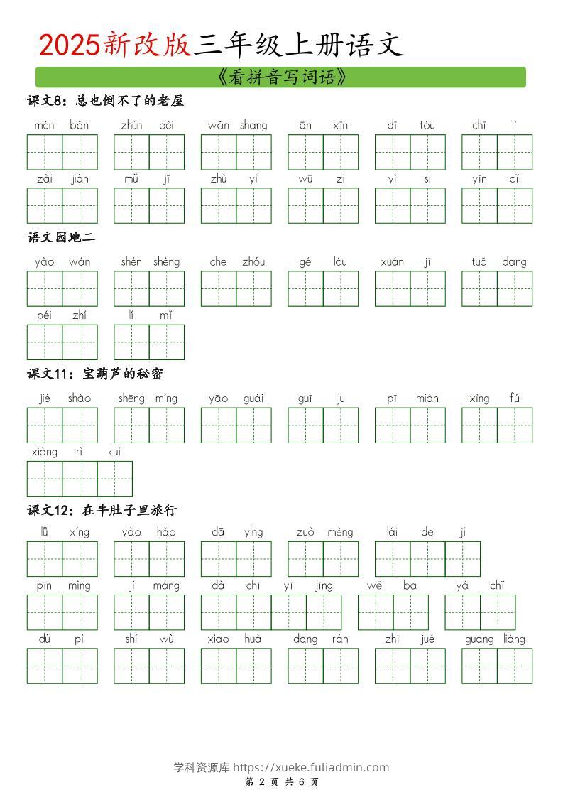 25新三上语文看拼音写词语6页学科资源库26天前发布关注私信471525新三上语文看拼音写词语6页此内容为付费资源,请付费后查看¥10黄金会员免费钻石会员免费立即购买您当前未登录!建议登陆后购买,可保存购买订单格式pdf页数6 页大小94.00 KB付费资源 ——预览已结束,还剩4页未读——开通会员后可免费下载高清完整文档 © 版权声明文章版权归作者所有,未经允许请勿转载。THE END小学语文 喜欢就支持一下吧点赞15 分享QQ空间微博QQ好友海报分享复制链接收藏