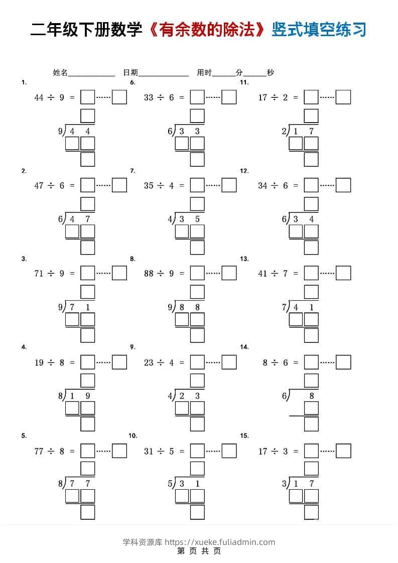 二年级下数学《有余数的除法》竖式填空练习学科资源库昨天发布关注私信2611二年级下数学《有余数的除法》竖式填空练习此内容为付费资源,请付费后查看¥10黄金会员免费钻石会员免费立即购买您当前未登录!建议登陆后购买,可保存购买订单格式pdf页数7 页大小1.01 MB付费资源 ——预览已结束,还剩5页未读——开通会员后可免费下载高清完整文档 © 版权声明文章版权归作者所有,未经允许请勿转载。THE END小学数学 喜欢就支持一下吧点赞11 分享QQ空间微博QQ好友海报分享复制链接收藏