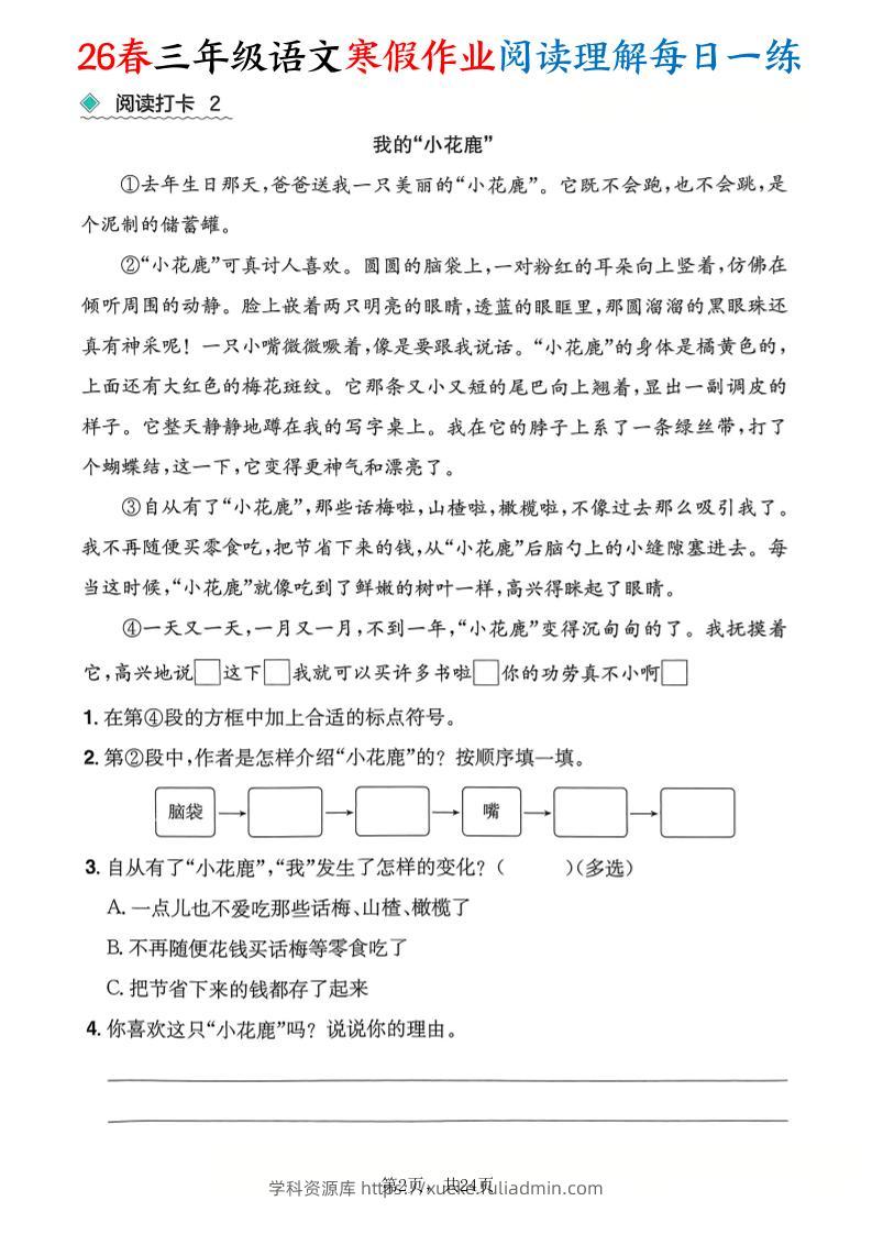 26春三年级语文下寒假作业阅读理解每日一练24页学科资源库7小时前发布关注私信25526春三年级语文下寒假作业阅读理解每日一练24页此内容为付费资源,请付费后查看¥10黄金会员免费钻石会员免费立即购买您当前未登录!建议登陆后购买,可保存购买订单格式pdf页数24 页大小12.61 MB付费资源 ——预览已结束,还剩22页未读——开通会员后可免费下载高清完整文档 © 版权声明文章版权归作者所有,未经允许请勿转载。THE END小学语文 喜欢就支持一下吧点赞5 分享QQ空间微博QQ好友海报分享复制链接收藏