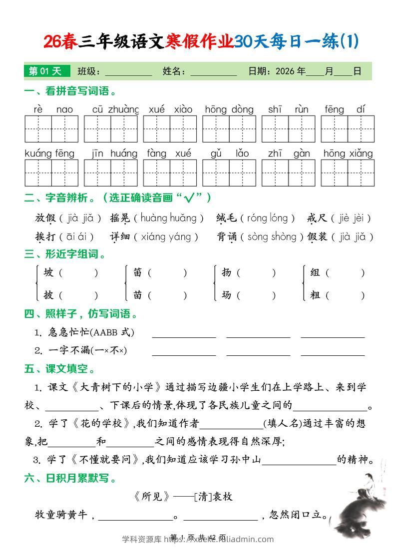 26春三年级下语文寒假作业30天每日一练打卡练习(含答案42页)学科资源库昨天发布关注私信30726春三年级下语文寒假作业30天每日一练打卡练习(含答案42页)此内容为付费资源,请付费后查看¥10黄金会员免费钻石会员免费立即购买您当前未登录!建议登陆后购买,可保存购买订单格式pdf页数42 页大小3.31 MB付费资源 ——预览已结束,还剩40页未读——开通会员后可免费下载高清完整文档 © 版权声明文章版权归作者所有,未经允许请勿转载。THE END小学语文 喜欢就支持一下吧点赞7 分享QQ空间微博QQ好友海报分享复制链接收藏