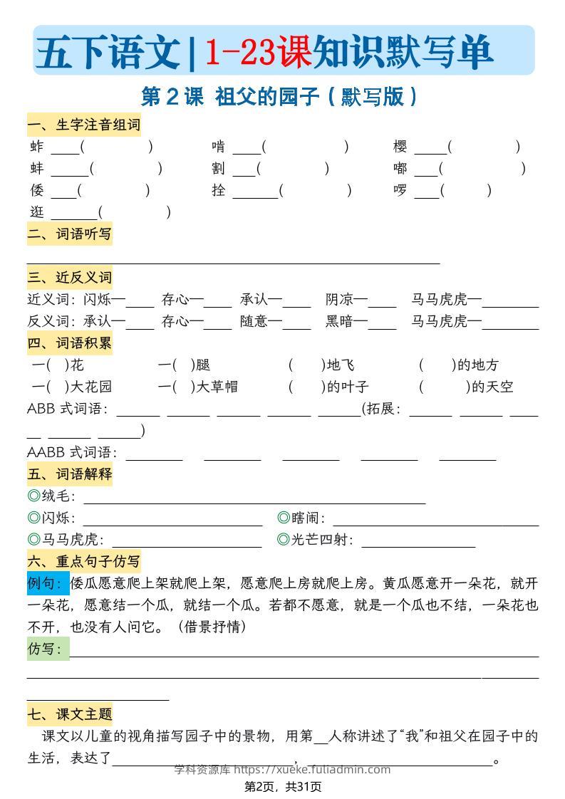 五下语文1-23课每课知识晨读单(空白默写版)31页学科资源库昨天发布关注私信4415五下语文1-23课每课知识晨读单(空白默写版)31页此内容为付费资源,请付费后查看¥10黄金会员免费钻石会员免费立即购买您当前未登录!建议登陆后购买,可保存购买订单格式pdf页数31 页大小1.52 MB付费资源 ——预览已结束,还剩29页未读——开通会员后可免费下载高清完整文档 © 版权声明文章版权归作者所有,未经允许请勿转载。THE END小学语文 喜欢就支持一下吧点赞15 分享QQ空间微博QQ好友海报分享复制链接收藏