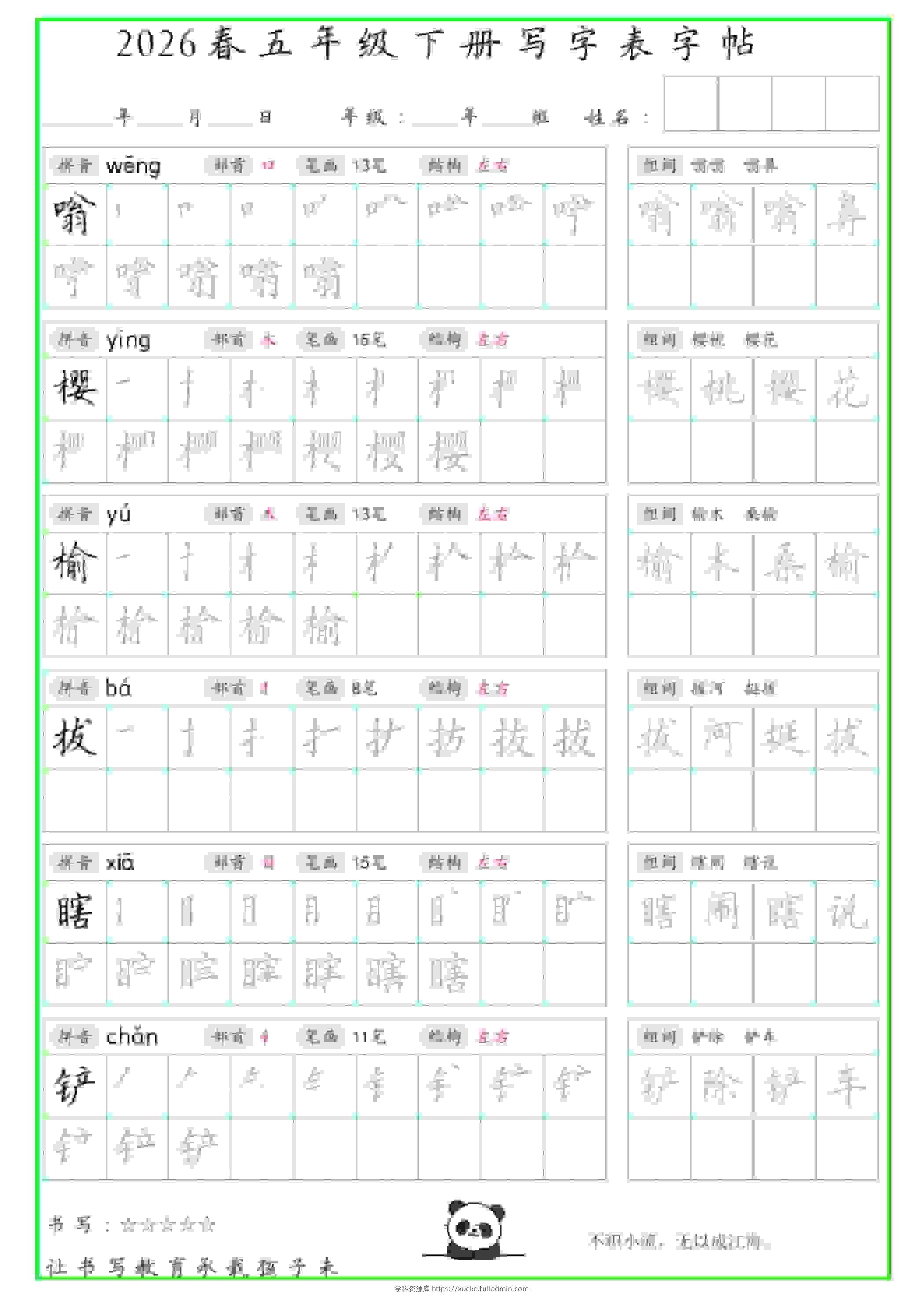 五年级下语文写字表笔顺组词字帖(绿色)学科资源库昨天发布关注私信2212五年级下语文写字表笔顺组词字帖(绿色)此内容为付费资源,请付费后查看¥10黄金会员免费钻石会员免费立即购买您当前未登录!建议登陆后购买,可保存购买订单格式pdf页数30 页大小4.92 MB付费资源 ——预览已结束,还剩28页未读——开通会员后可免费下载高清完整文档 © 版权声明文章版权归作者所有,未经允许请勿转载。THE END小学语文 喜欢就支持一下吧点赞12 分享QQ空间微博QQ好友海报分享复制链接收藏