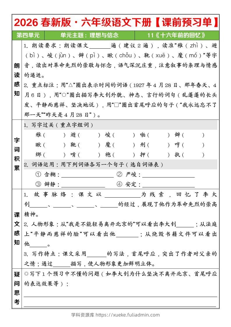六年级下语文26春第四单元课前预习单学科资源库昨天发布关注私信347六年级下语文26春第四单元课前预习单此内容为付费资源,请付费后查看¥10黄金会员免费钻石会员免费立即购买您当前未登录!建议登陆后购买,可保存购买订单格式pdf页数5 页大小547.19 KB付费资源 ——预览已结束,还剩3页未读——开通会员后可免费下载高清完整文档 © 版权声明文章版权归作者所有,未经允许请勿转载。THE END小学语文 喜欢就支持一下吧点赞7 分享QQ空间微博QQ好友海报分享复制链接收藏