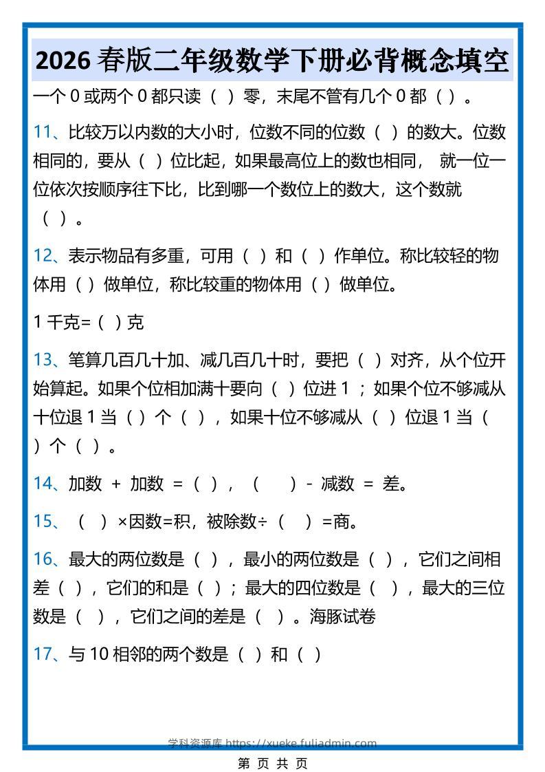 2026春新版二年级下数学必背概念填空学科资源库昨天发布关注私信49142026春新版二年级下数学必背概念填空此内容为付费资源,请付费后查看¥10黄金会员免费钻石会员免费立即购买您当前未登录!建议登陆后购买,可保存购买订单格式pdf页数6 页大小272.18 KB付费资源 ——预览已结束,还剩4页未读——开通会员后可免费下载高清完整文档 © 版权声明文章版权归作者所有,未经允许请勿转载。THE END小学数学 喜欢就支持一下吧点赞14 分享QQ空间微博QQ好友海报分享复制链接收藏