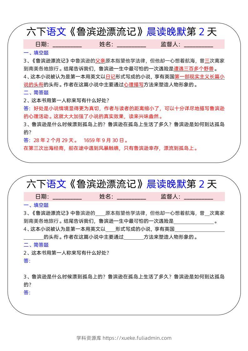 六年级下语文《鲁滨逊漂流记》晨读晚默小纸条(15天)学科资源库昨天发布关注私信4913六年级下语文《鲁滨逊漂流记》晨读晚默小纸条(15天)此内容为付费资源,请付费后查看¥10黄金会员免费钻石会员免费立即购买您当前未登录!建议登陆后购买,可保存购买订单格式pdf页数15 页大小742.49 KB付费资源 ——预览已结束,还剩13页未读——开通会员后可免费下载高清完整文档 © 版权声明文章版权归作者所有,未经允许请勿转载。THE END小学语文 喜欢就支持一下吧点赞13 分享QQ空间微博QQ好友海报分享复制链接收藏