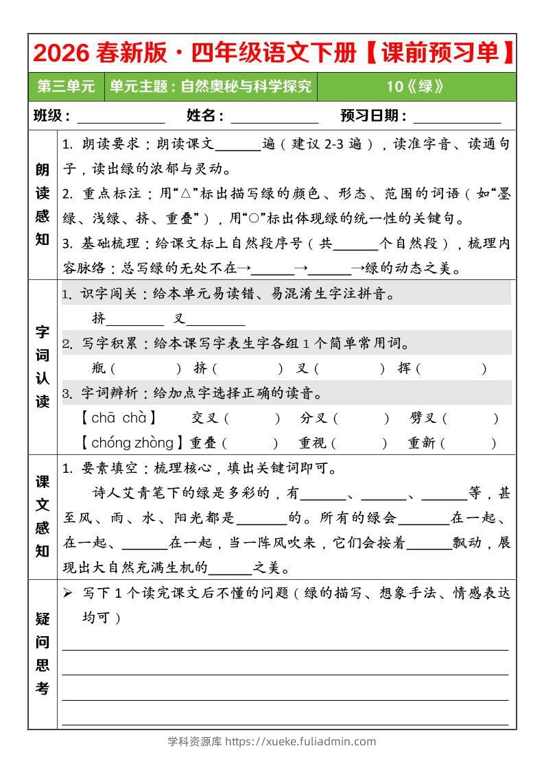 四年级下语文26春第三单元课前预习单学科资源库6小时前发布关注私信5013四年级下语文26春第三单元课前预习单此内容为付费资源,请付费后查看¥10黄金会员免费钻石会员免费立即购买您当前未登录!建议登陆后购买,可保存购买订单格式pdf页数5 页大小603.27 KB付费资源 ——预览已结束,还剩3页未读——开通会员后可免费下载高清完整文档 © 版权声明文章版权归作者所有,未经允许请勿转载。THE END小学语文 喜欢就支持一下吧点赞13 分享QQ空间微博QQ好友海报分享复制链接收藏